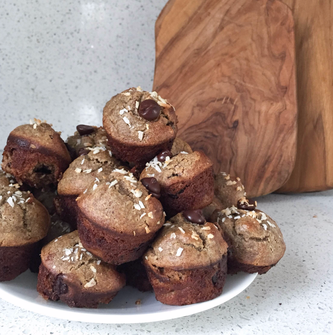 In your blender, mix all the ingredients except for the chocolate chips. Blend on high until smooth. Pour batter out into a bowl and mix in chocolate chips. Pour muffin batter into the tray cups ¾ of the way. Top with a chocolate chip and a sprinkle of coconut flakes. Bake 10-12 minutes for large muffins or 8-9 minutes for mini muffins.